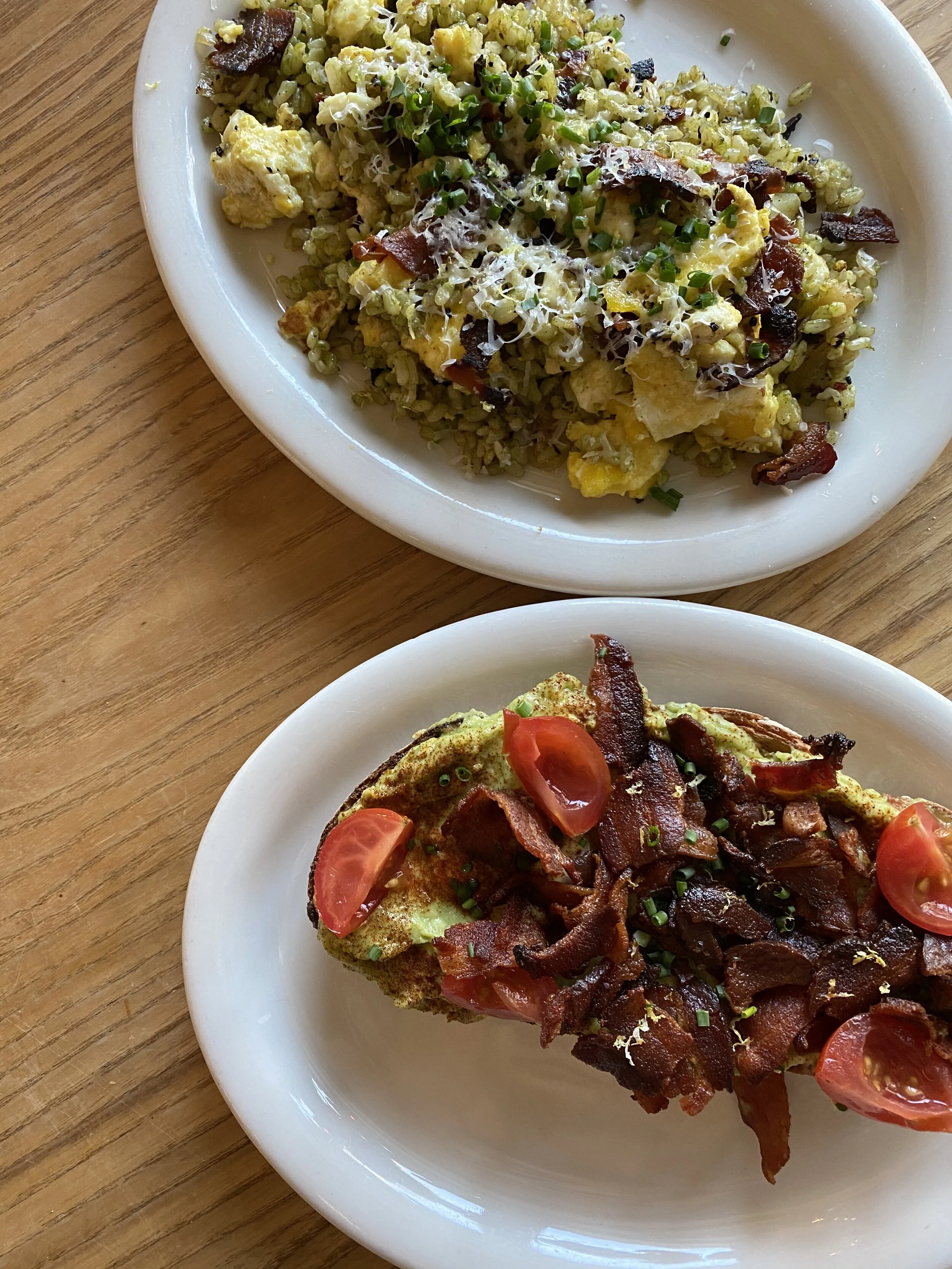 top: cilantro bacon fried rice, bottom: smoked avocado toast